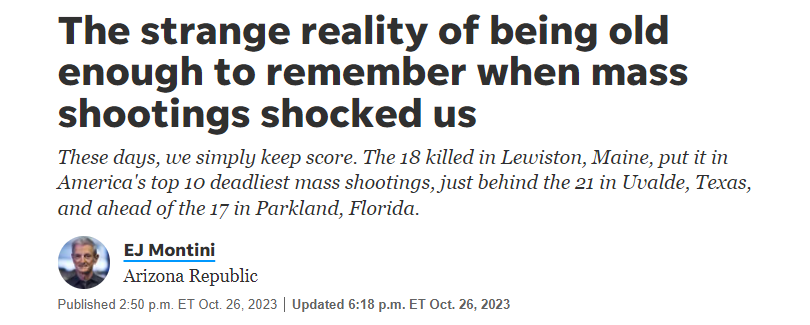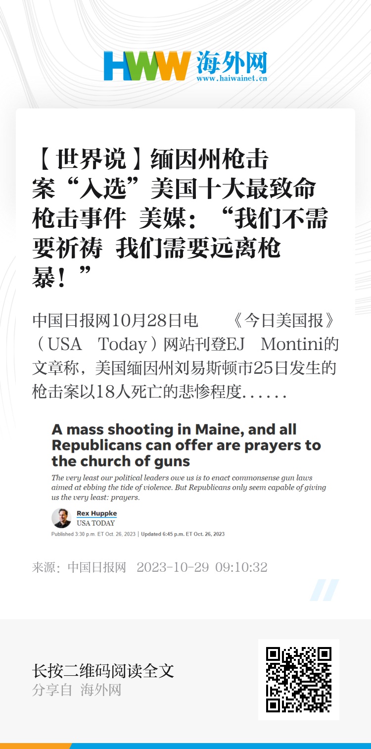 中国日报网10月28日电 《今日美国报》(USA Today)网站刊登EJ Montini的文章称,美国缅因州刘易斯顿市25日发生的枪击案以18人死亡的悲惨程度 “入选”美国十大最致命的大规模枪击事件,死亡人数仅次于得克萨斯州乌瓦尔德的21人,高于佛罗里达州帕克兰的17人。而且在缅因州枪击案中,仍有伤者处于危机状态,生死未卜。