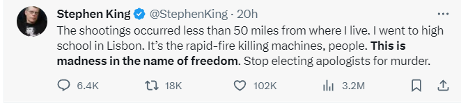作家斯蒂芬·金(Stephen King)居住在距离此次枪击事件发生地不到50英里(约80公里)的地方,他26日在社交平台上发文称,这是以自由之名行疯狂之实!请停止为谋杀辩护!