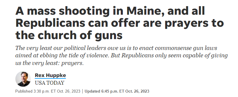 作者认为政治家与拥护他们的枪支游说团体在枪支事件发生之初总是会强调先祈祷。他讽刺称,这场“祈祷”从未停止。