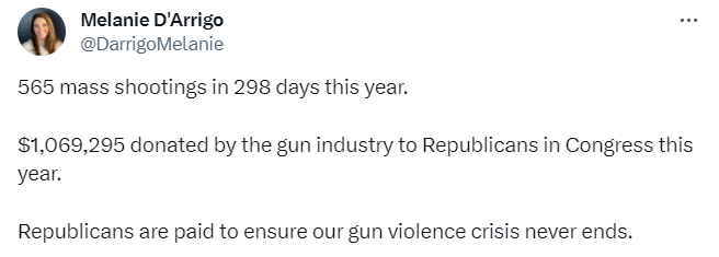 更有网友讽刺称,面对着今年298天内的565场大规模枪击事件,美国共和党选择拿着枪支行业的钱,来确保美国的枪支暴力绝不结束。