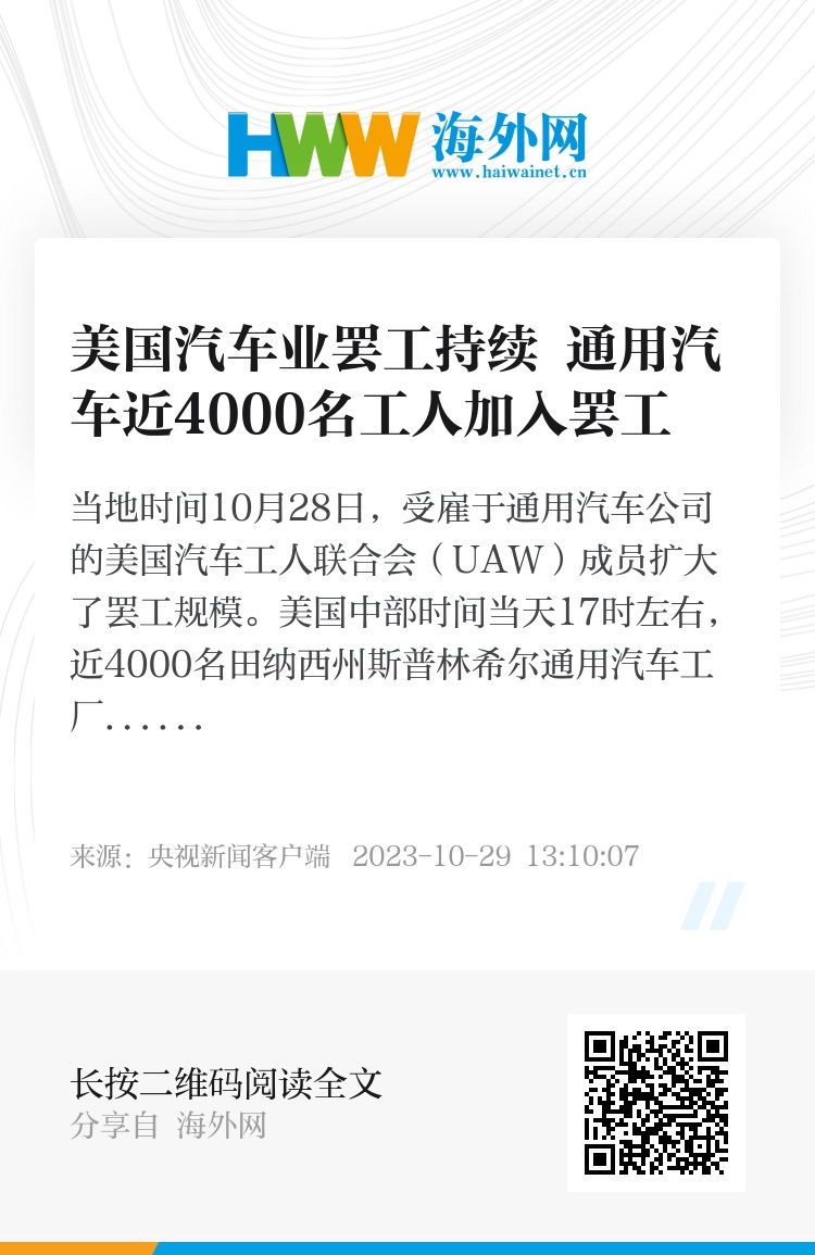 由于通用、福特以及斯特兰蒂斯三大汽车制造商不能满足汽车工人提出的涨薪、提高失业保险、医疗保险等要求,美国汽车工人联合会组织工人于9月15日起开始罢工。截至10月19日,罢工已致美汽车行业损失约93亿美元。(央视记者 徐德智)