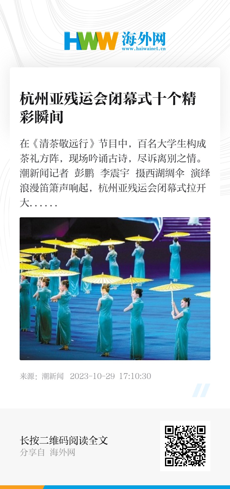 “视觉方面,闭幕式以汝窑瓷器和宋代绘画汲取灵感,使用天青色为底色,地屏以中国传统绘画的扇面影像相配合,用现代化的视觉语言表现出中国文化的气韵。”杭州亚残运会闭幕式总导演沙晓岚介绍。