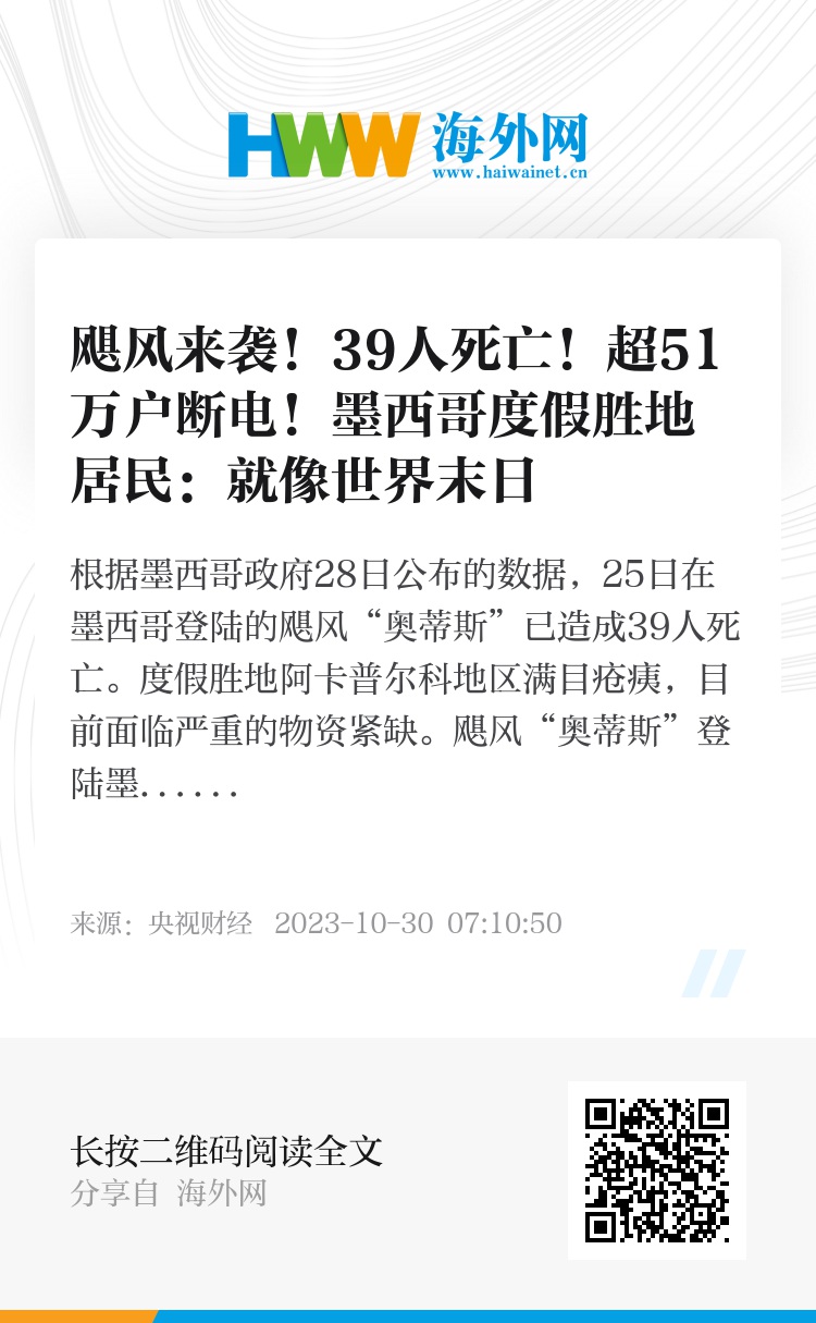 根据墨西哥政府28日公布的数据,25日在墨西哥登陆的飓风“奥蒂斯”已造成39人死亡。度假胜地阿卡普尔科地区满目疮痍,目前面临严重的物资紧缺。