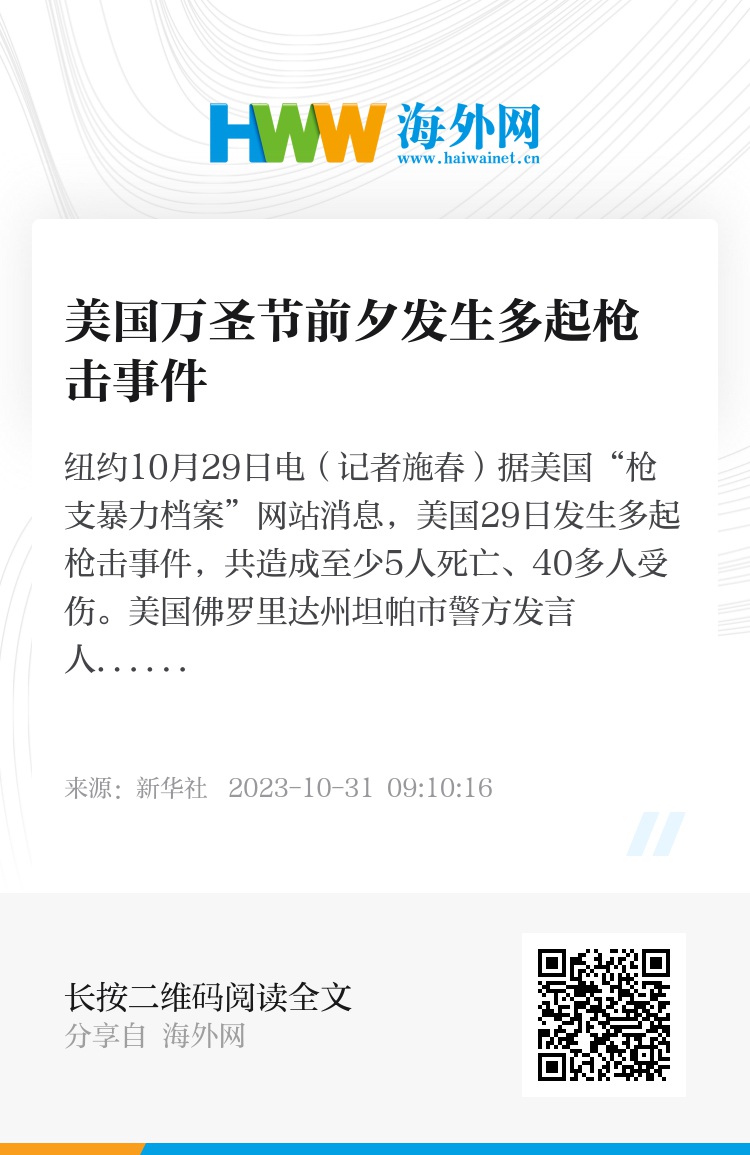 新华社纽约10月29日电(记者施春)据美国“枪支暴力档案”网站消息,美国29日发生多起枪击事件,共造成至少5人死亡、40多人受伤。