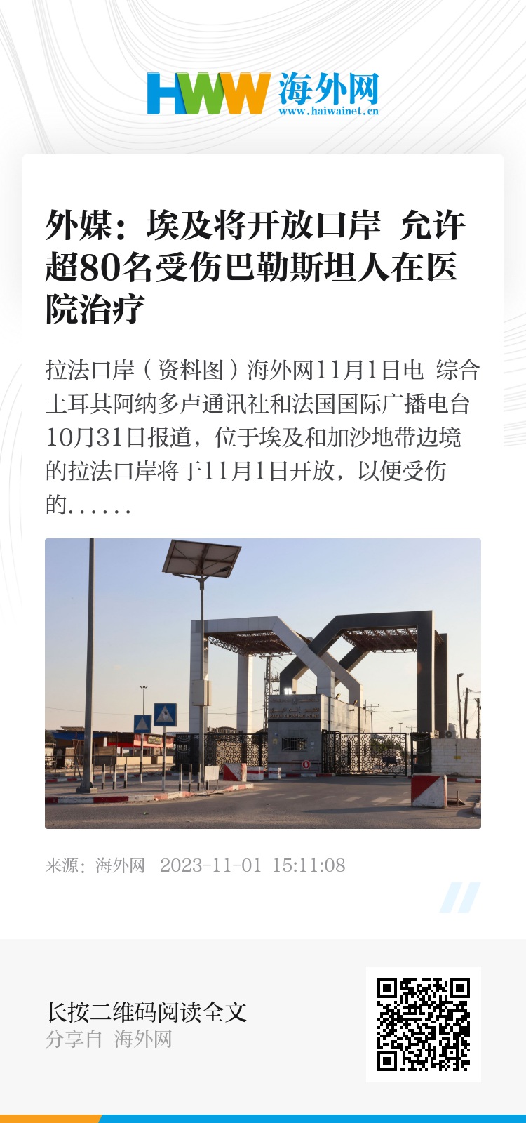 海外网11月1日电 综合土耳其阿纳多卢通讯社和法国国际广播电台10月31日报道,位于埃及和加沙地带边境的拉法口岸将于11月1日开放,以便受伤的81名巴勒斯坦人能够在埃及的医院接受治疗。
