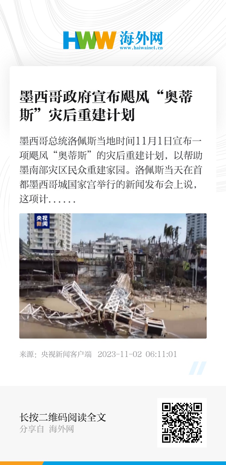 墨西哥总统洛佩斯当地时间11月1日宣布一项飓风“奥蒂斯”的灾后重建计划,以帮助墨南部灾区民众重建家园。