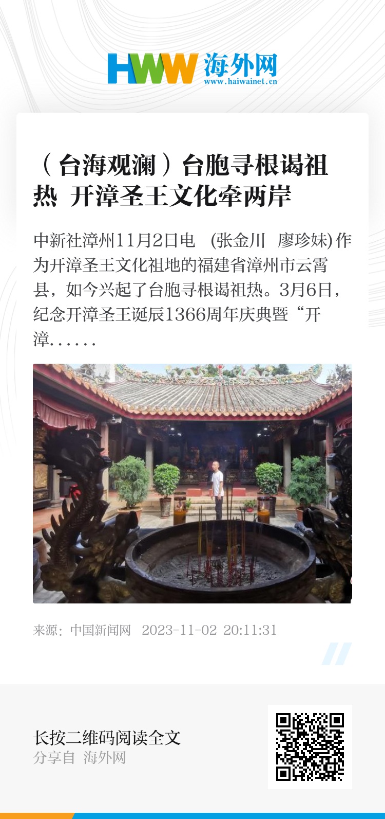 中新社漳州11月2日电 (张金川 廖珍妹)作为开漳圣王文化祖地的福建省漳州市云霄县,如今兴起了台胞寻根谒祖热。