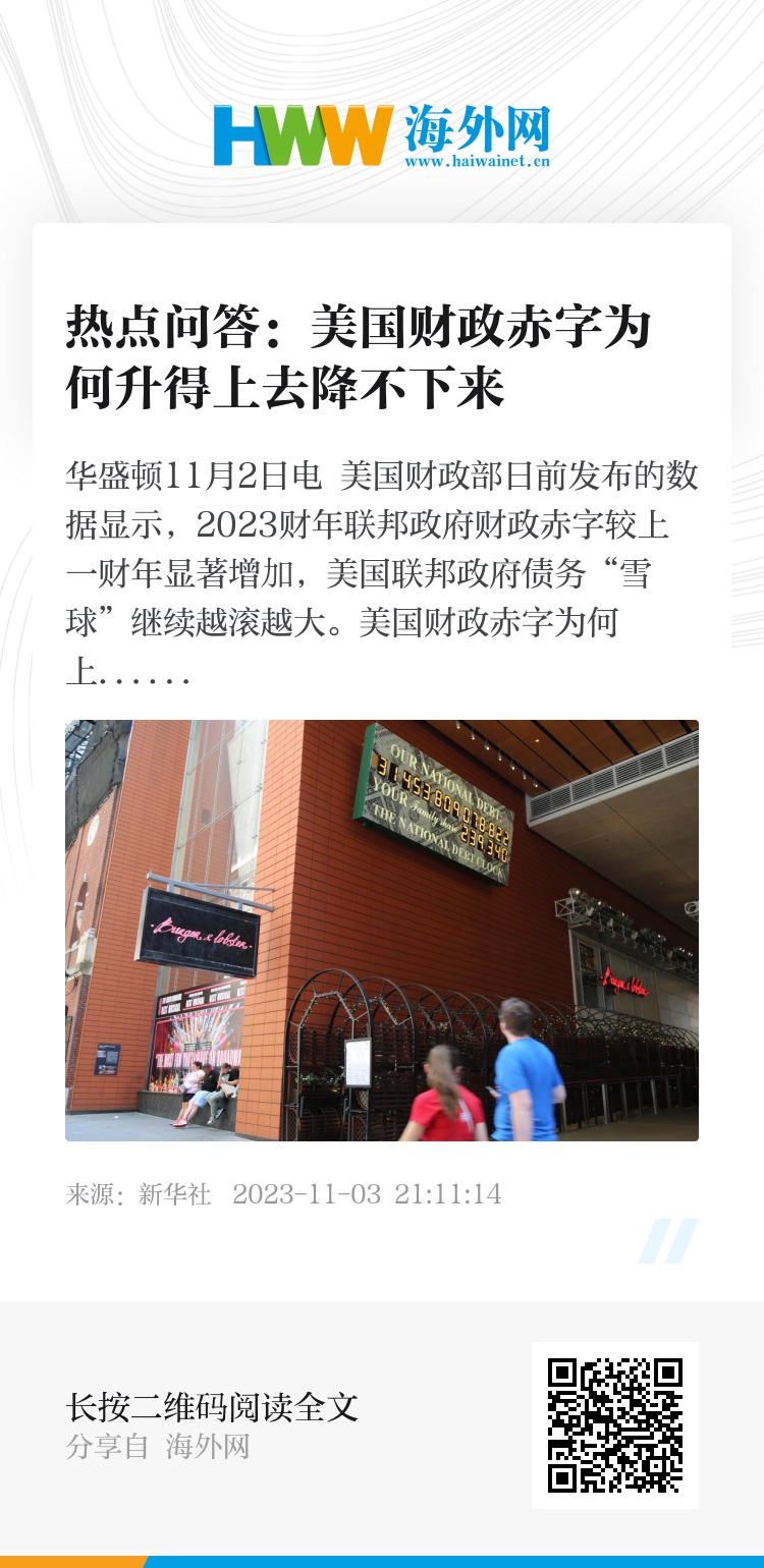 新华社华盛顿11月2日电 美国财政部日前发布的数据显示,2023财年联邦政府财政赤字较上一财年显著增加,美国联邦政府债务“雪球”继续越滚越大。美国财政赤字为何上升?削减财政赤字面临哪些障碍?财政赤字对大选有何影响?