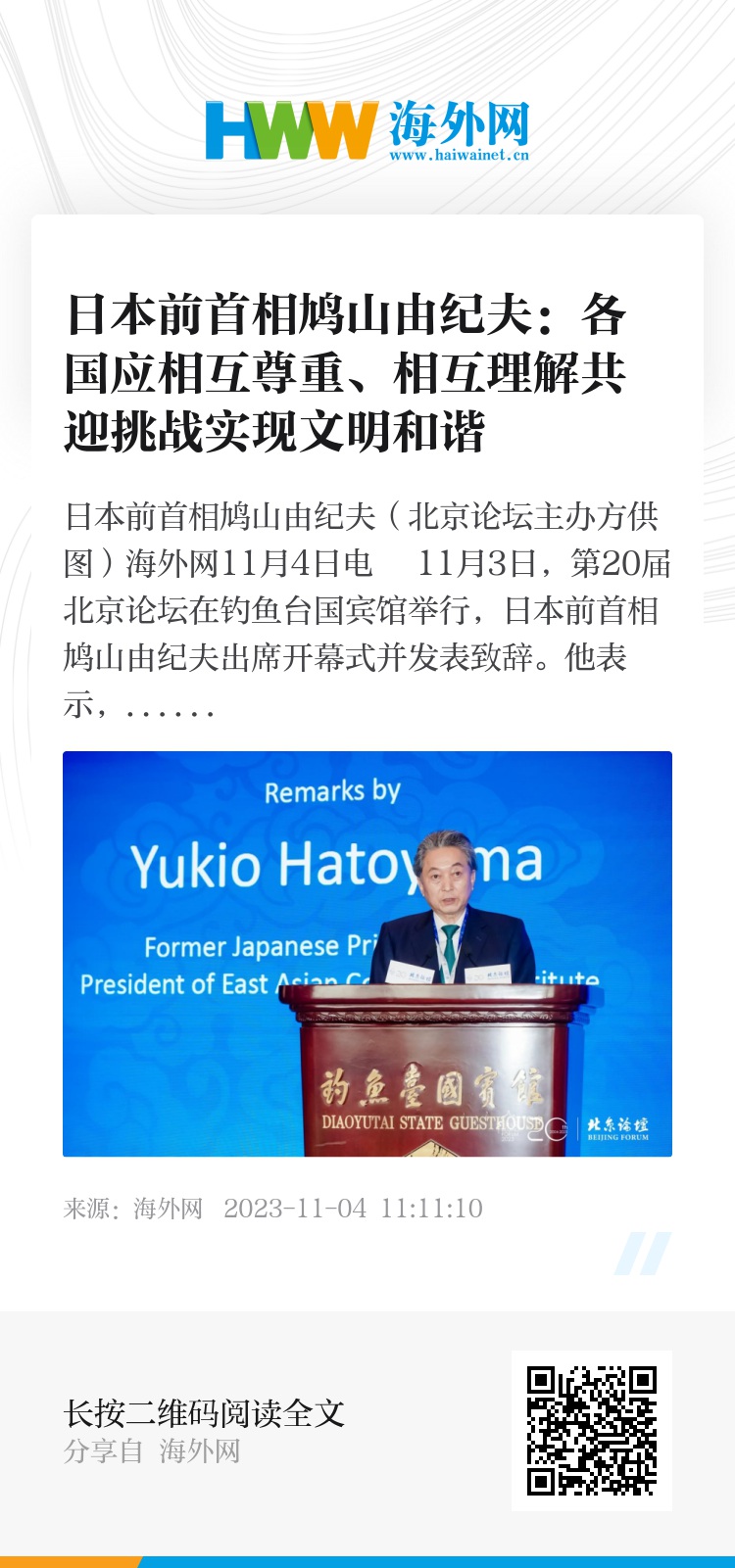 海外网11月4日电 11月3日,第20届北京论坛在钓鱼台国宾馆举行,日本前首相鸠山由纪夫出席开幕式并发表致辞。他表示,希望各国相互尊重、相互理解、共迎挑战,努力实现文明的和谐。