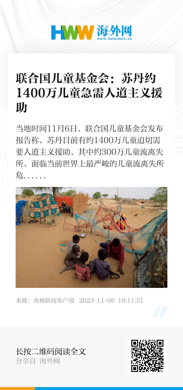 当地时间11月6日,联合国儿童基金会发布报告称,苏丹目前有约1400万儿童迫切需要人道主义援助,其中约300万儿童流离失所,面临当前世界上最严峻的儿童流离失所危机。