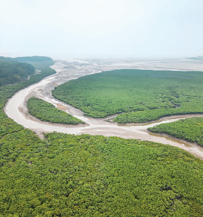 广西山口红树林生态国家级自然保护区地处广西合浦县东南部沙田半岛的东西两侧,由该岛东侧和西侧的海域、陆域及全部滩涂组成,面积8000公顷。图为保护区一角。徐谭摄