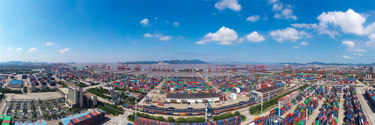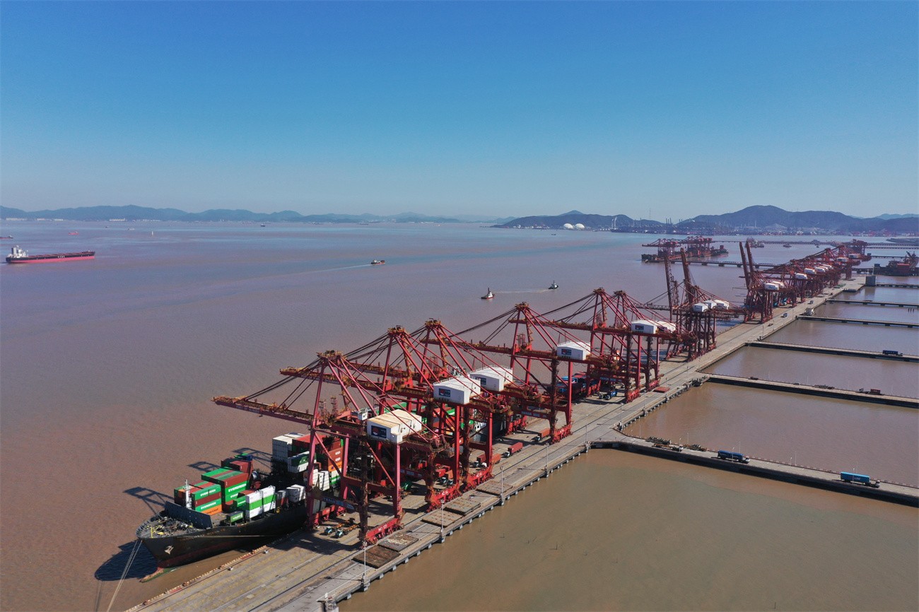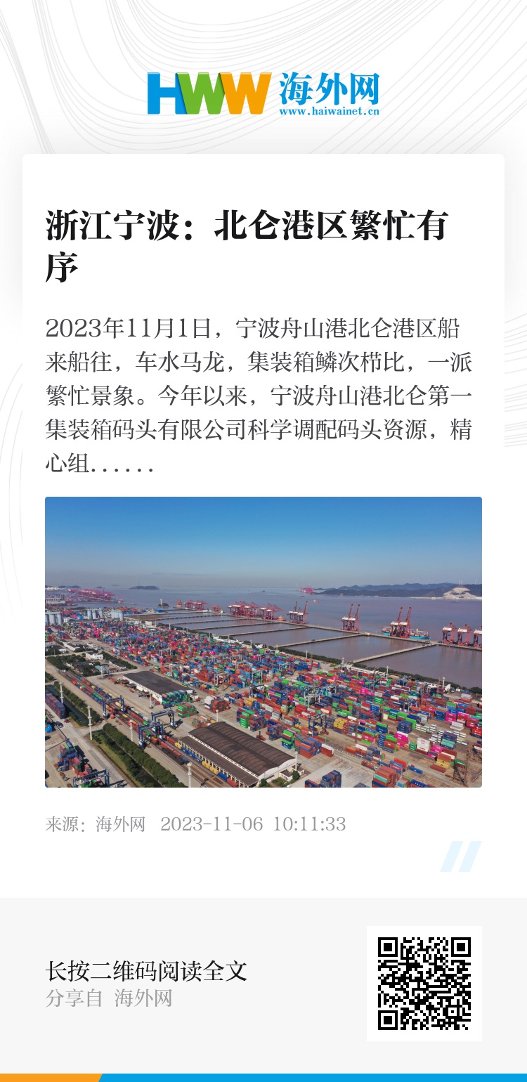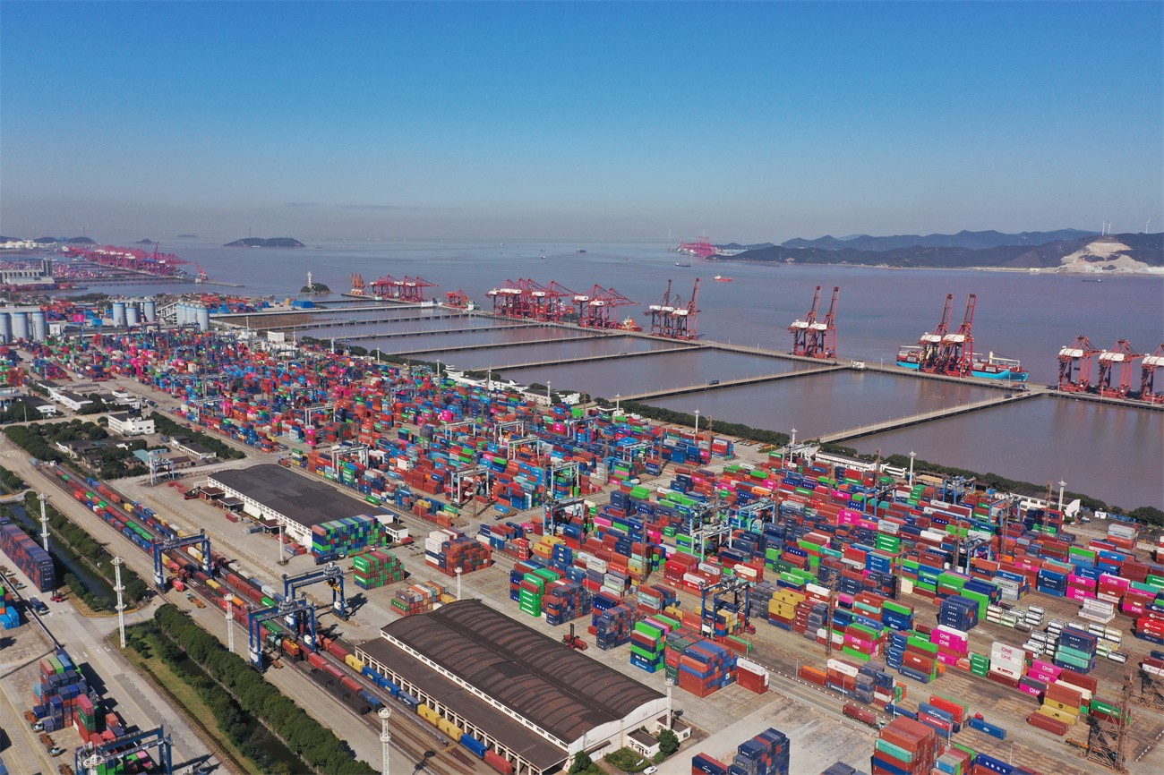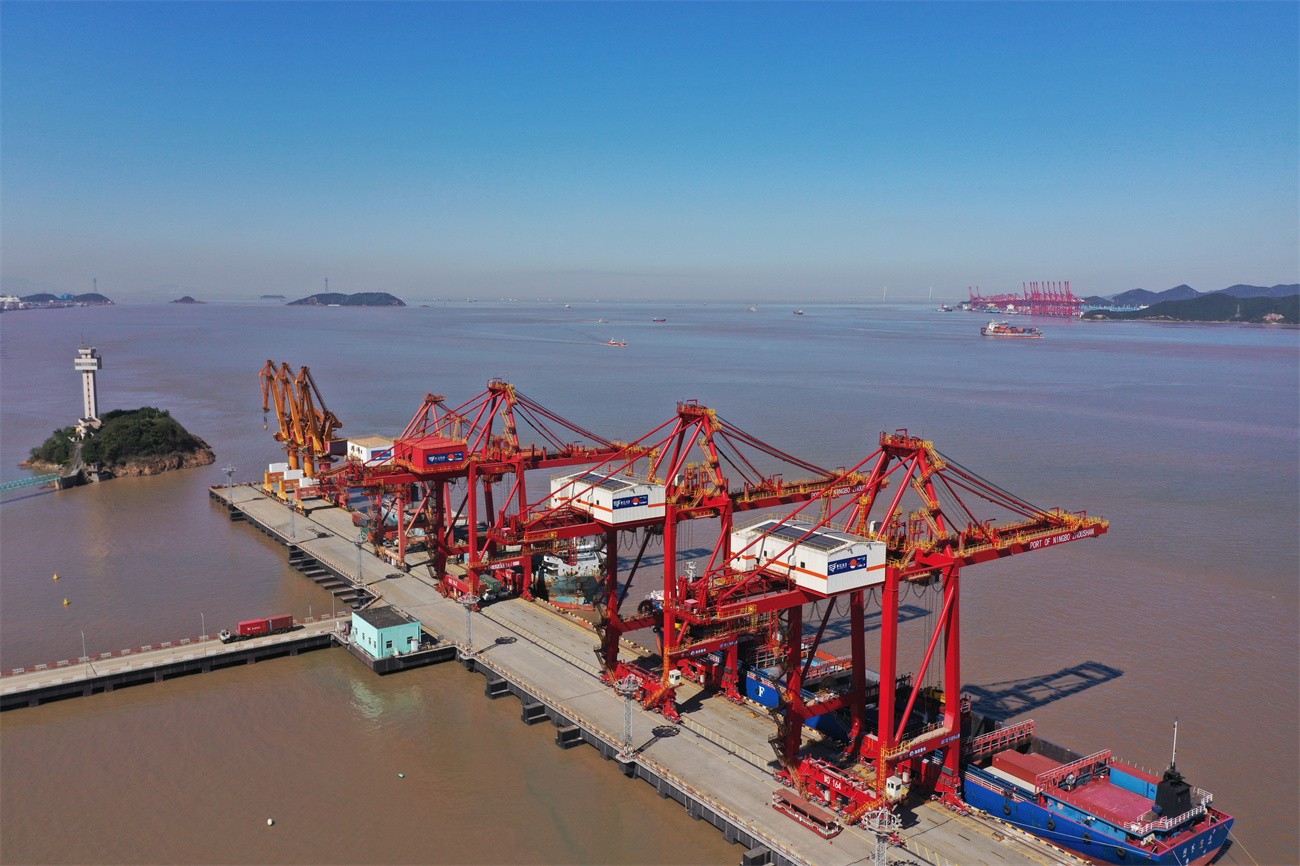 2023年11月1日,宁波舟山港北仑港区船来船往,车水马龙,集装箱鳞次栉比,一派繁忙景象。