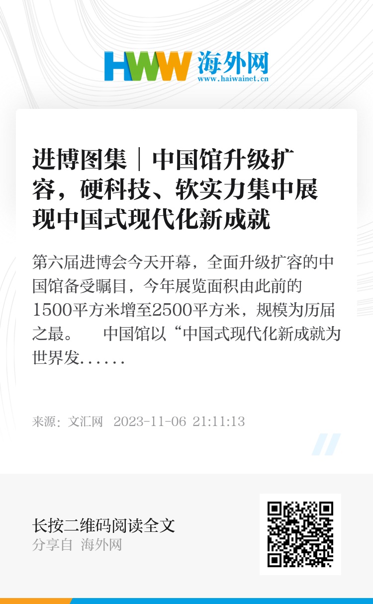 第六届进博会今天开幕,全面升级扩容的中国馆备受瞩目,今年展览面积由此前的1500平方米增至2500平方米,规模为历届之最。 中国馆以“中国式现代化新成就为世界发展提供新机遇”为主题,从大国重器到传统文化,有“硬科技”,也有“软实力”,一个个展位集中展现了新时代中国高水平对外开放和高质量发展的成就,处处彰显“大国自信”。