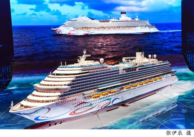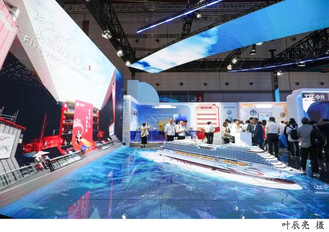 中国馆内展出我国首艘国产大型邮轮爱达·魔都号模型,爱达·魔都号与进博会颇有渊源,五年前,在首届进口博览会上,中国船舶集团与国际合作伙伴签署了新造船合同,并许下了“始于进博、交于进博”的五年之约。历时五年的设计建造,爱达·魔都号在第六届进博会开幕前正式命名交付。