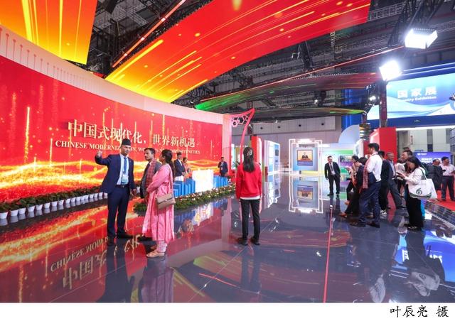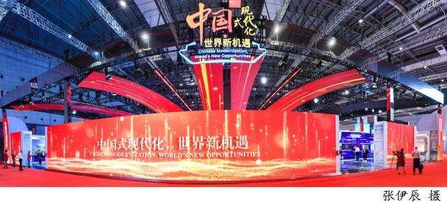 第六届进博会中国馆以“中国式现代化新成就为世界发展提供新机遇”为主题,以中国式现代化五大特征为主线,集中展示新时代中国高水平对外开放和高质量发展成就,阐述中国式现代化的世界意义。