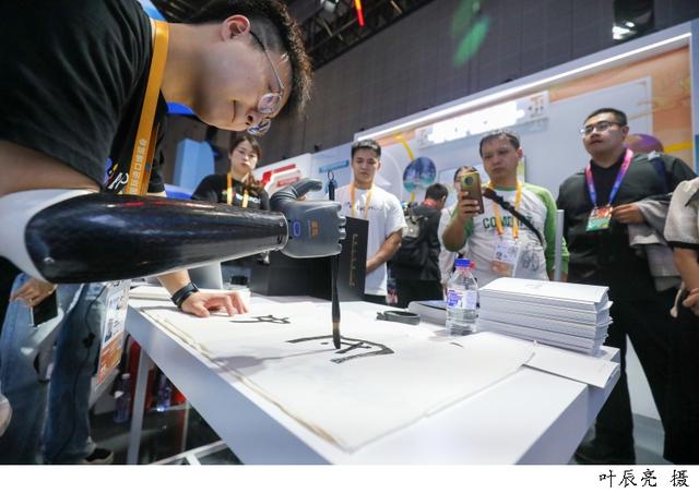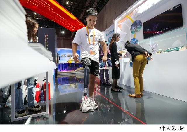 中国馆内展出一家企业研发的,通过神经控制的机械手和义肢等产品,借助这一创新产品残障人士有望重获新生。