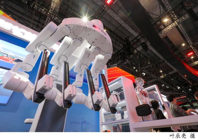 中国馆内展出国产四臂腔镜手术机器人。中国(上海)自由贸易试验区率先试点医疗器械研发领域一系列新政策,培育了一批有竞争力的企业。国产四臂腔镜手术机器人即是园区内企业创新的成果。
