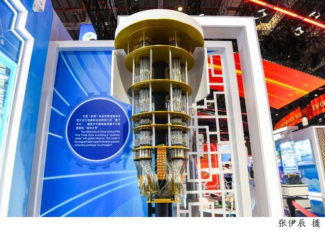 中国馆内展出的可编程量子计算系统“祖冲之号”,该装置为目前量子比特数目最多的超导量子计算原型机,处理特定问题速度比目前最快的超级计算机快一千万倍,使我国首次在超导体系达到“量子计算优越性”里程碑。