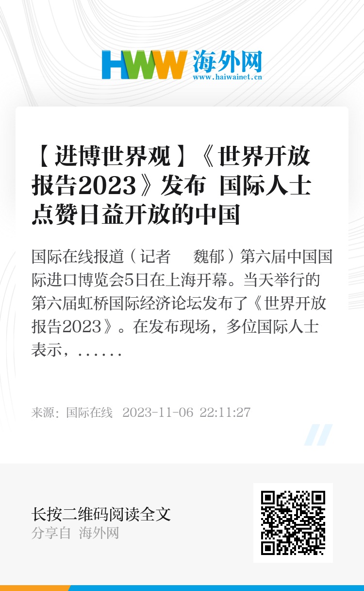 国际在线报道(记者 魏郁)第六届中国国际进口博览会5日在上海开幕。当天举行的第六届虹桥国际经济论坛发布了《世界开放报告2023》。在发布现场,多位国际人士表示,中国持续开放的承诺,对所有在华经营和投资的企业具有重要意义。