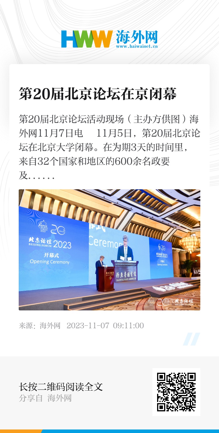 海外网11月7日电 11月5日,第20届北京论坛在北京大学闭幕。在为期3天的时间里,来自32个国家和地区的600余名政要及专家学者齐聚一堂,共寻文明互鉴、合作共赢之道,以携手应对全球性挑战。