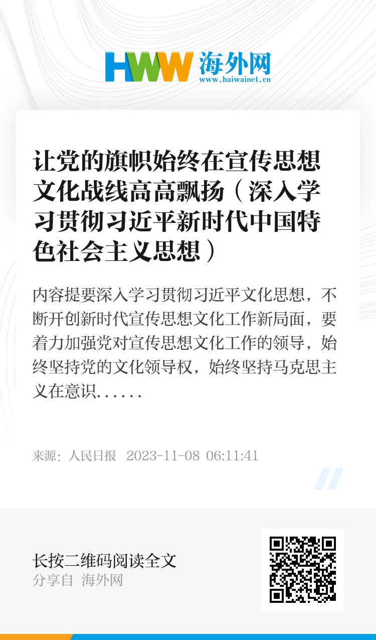 深入学习贯彻习近平文化思想,不断开创新时代宣传思想文化工作新局面,要着力加强党对宣传思想文化工作的领导,始终坚持党的文化领导权,始终坚持马克思主义在意识形态领域的指导地位,始终坚持中国特色社会主义文化发展道路,始终坚持以人民为中心的根本立场,让党的旗帜始终在宣传思想文化战线高高飘扬。