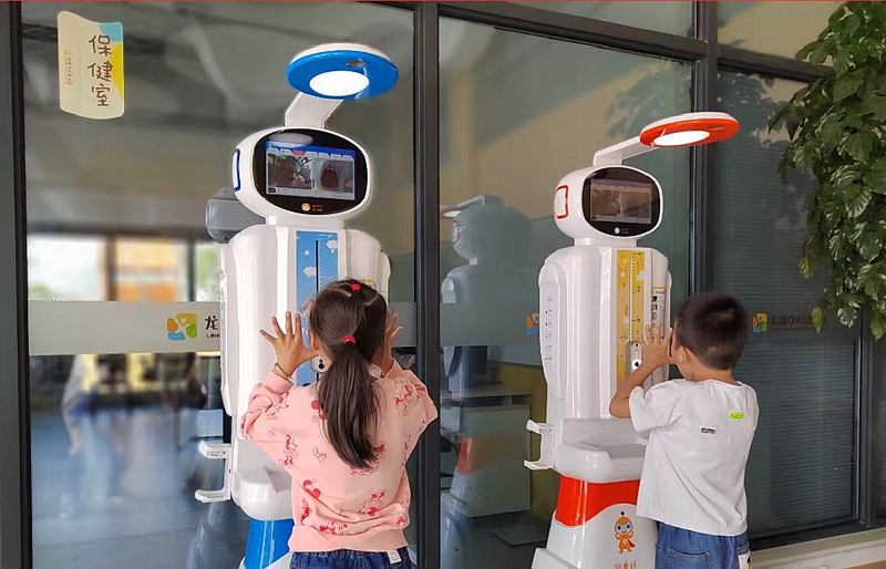 清晨,在乌镇龙翔中心幼儿园,晨检机器人正在对孩子们进行健康测量。乌镇镇人民政府供图