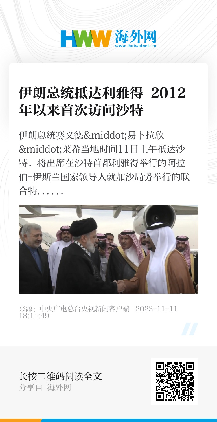 此前,时任伊朗总统马哈茂德·艾哈迈迪-内贾德曾于2007年和2012年两次访问沙特。2016年,沙特与伊朗断绝外交关系,在中国斡旋下,沙特与伊朗两国代表在2023年4月签署联合声明,宣布正式恢复外交关系。(总台记者 李享 李健南)
