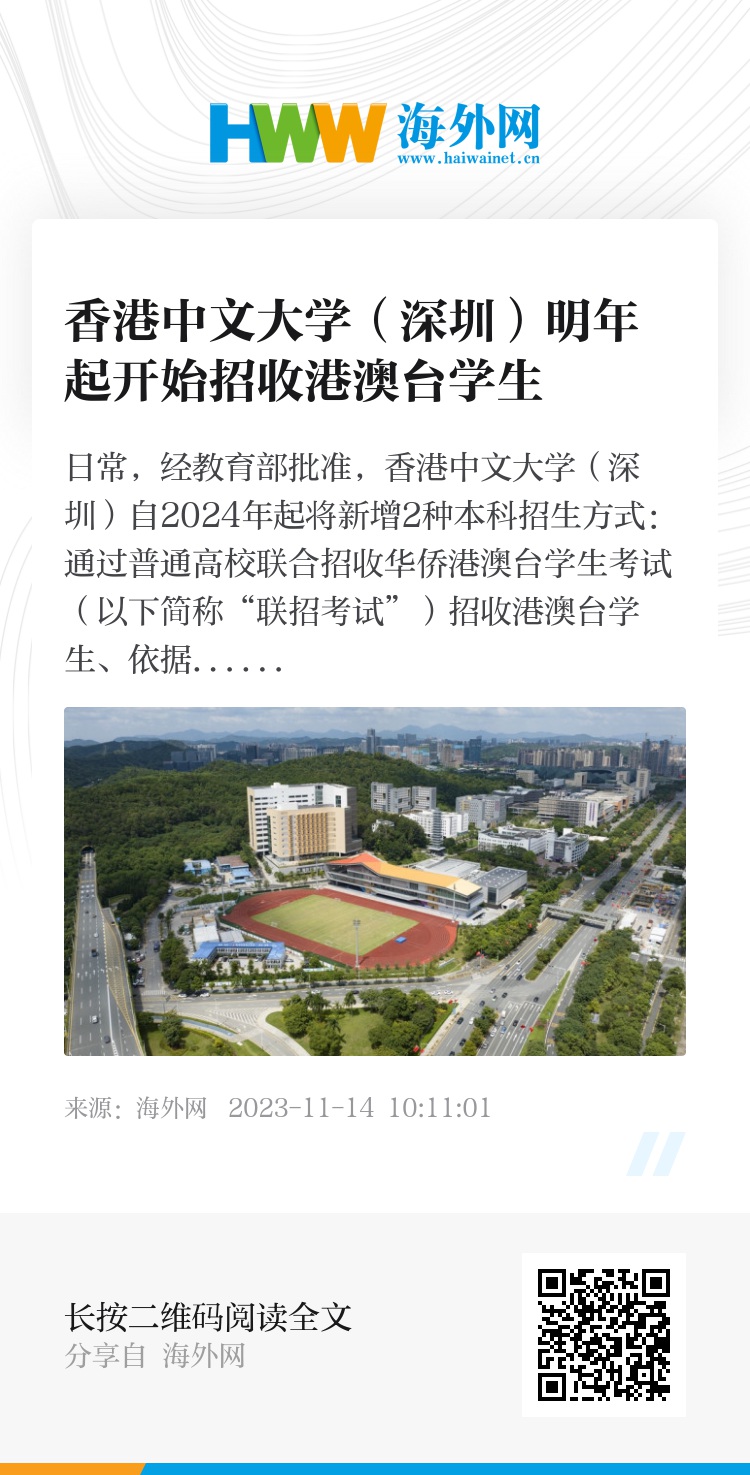 日常,经教育部批准,香港中文大学(深圳)自2024年起将新增2种本科招生方式:通过普通高校联合招收华侨港澳台学生考试(以下简称“联招考试”)招收港澳台学生、依据台湾“学测”成绩招收台湾学生。2023年,香港中文大学(深圳)在全国23个省(自治区、直辖市)共录取1434名内地本科生。图片来源:IC photo