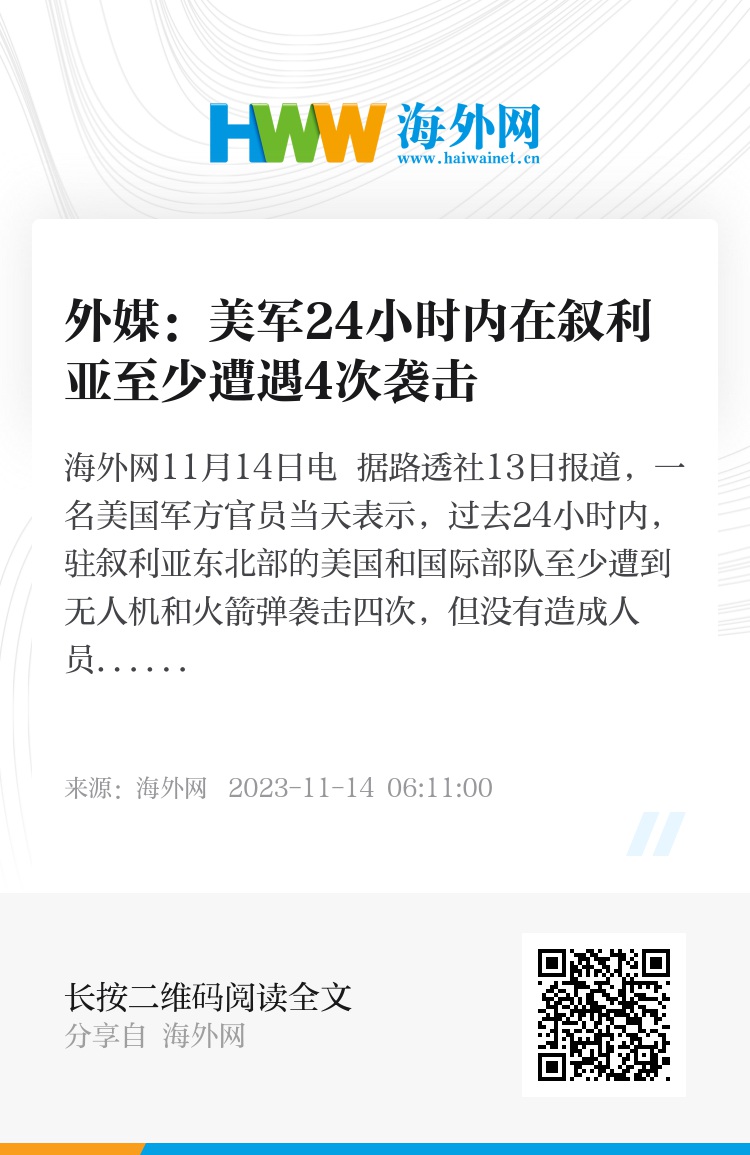 海外网11月14日电 据路透社13日报道,一名美国军方官员当天表示,过去24小时内,驻叙利亚东北部的美国和国际部队至少遭到无人机和火箭弹袭击四次,但没有造成人员伤亡,仅造成轻微损坏。