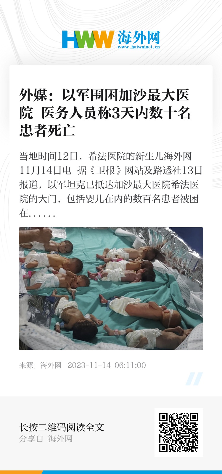 海外网11月14日电 据《卫报》网站及路透社13日报道,以军坦克已抵达加沙最大医院希法医院的大门,包括婴儿在内的数百名患者被困在院内,医务人员称数十名病人在3天内因缺乏燃料而死去。