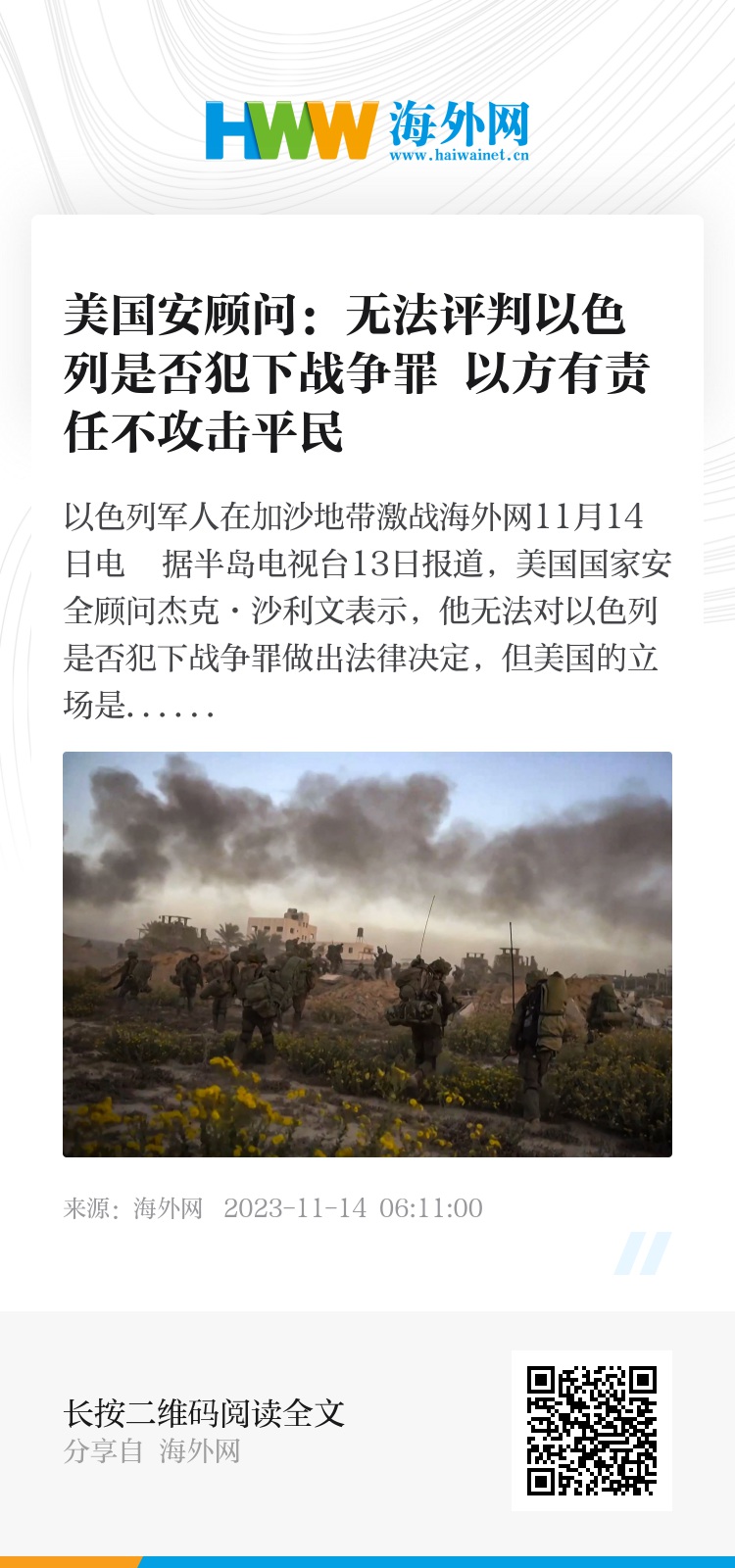 海外网11月14日电 据半岛电视台13日报道,美国国家安全顾问杰克·沙利文表示,他无法对以色列是否犯下战争罪做出法律决定,但美国的立场是以色列军队不应该攻击平民。