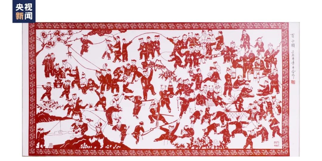 《百子图》是袁奶奶根据自己的童年回忆剪出来的作品,“琴棋书画、捉迷藏、翻跟斗、倒立、武术……这个是我童年玩的东西,我想用剪纸把它记载下来。一个人的动作有很多种,我就根据这个剪出了一百个小孩儿。”