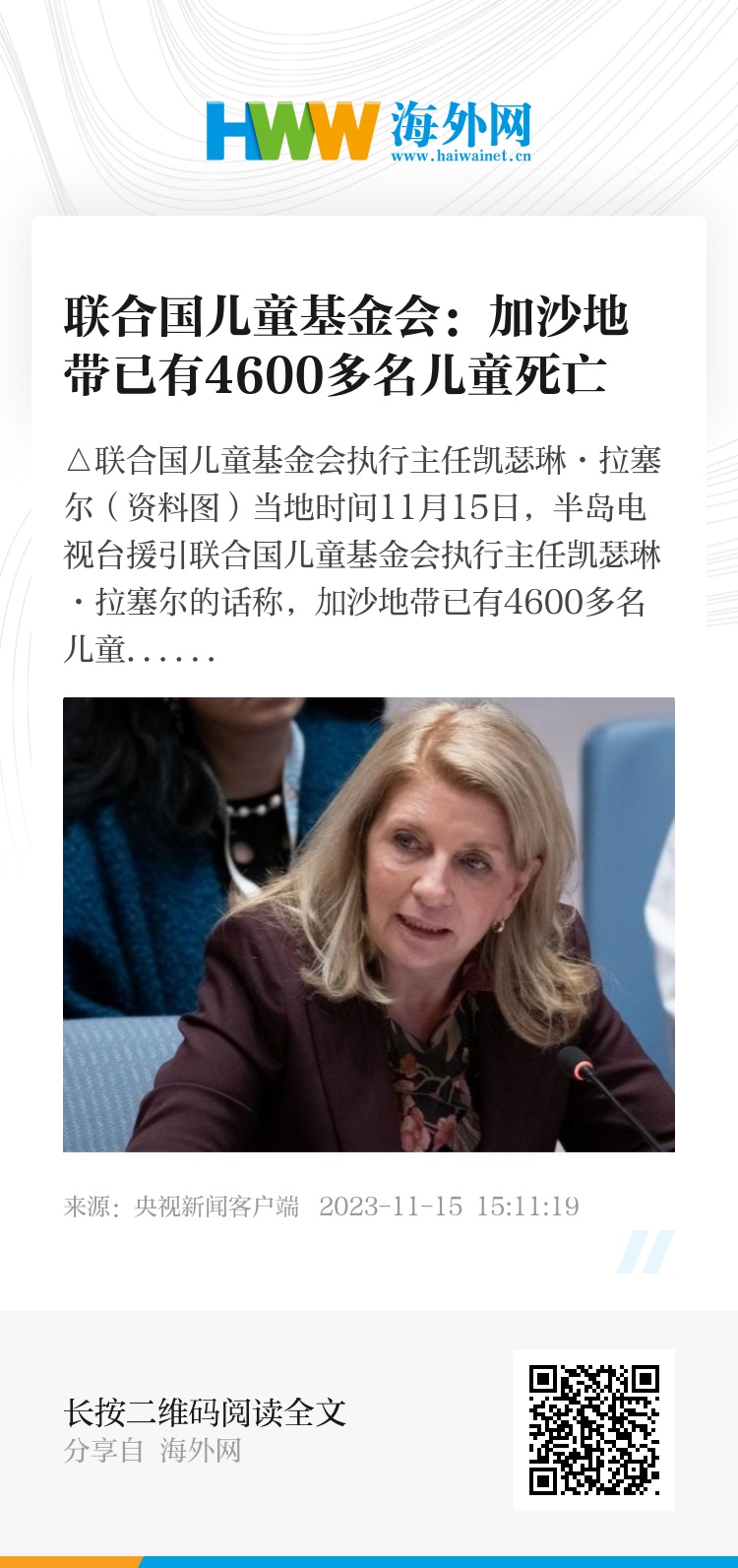 当地时间11月15日,半岛电视台援引联合国儿童基金会执行主任凯瑟琳·拉塞尔的话称,加沙地带已有4600多名儿童死亡,约9000人受伤。此外由于袭击曾发生在人口稠密地区,目前仍有许多儿童处于失踪状态,据悉他们仍被埋在废墟下面。(总台记者 王寅)