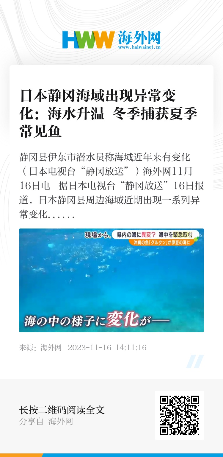 海外网11月16日电 据日本电视台“静冈放送”16日报道,日本静冈县周边海域近期出现一系列异常变化,如渔民在伊豆半岛海域捕获到本该在冲绳海域栖息的鱼、静冈县热海市11月的市场却摆着夏季常见的鱼类等。