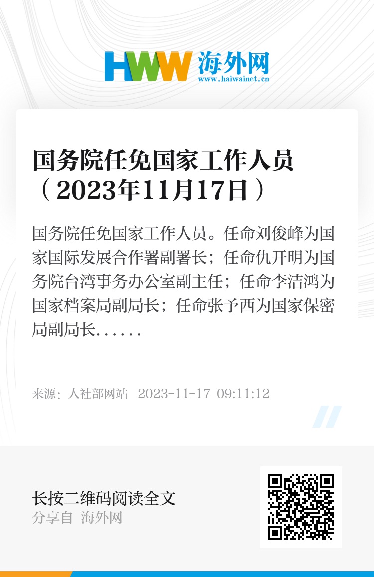 任命刘俊峰为国家国际发展合作署副署长;任命仇开明为国务院台湾事务办公室副主任;任命李洁鸿为国家档案局副局长;任命张予西为国家保密局副局长。