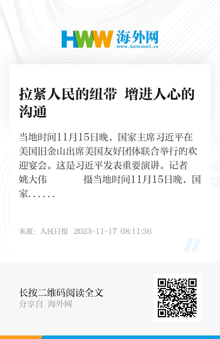 当地时间11月15日晚,国家主席习近平在美国旧金山出席美国友好团体联合举行的欢迎宴会并发表重要演讲,生动讲述中美友好交往历史,回顾与多位美国友人的深厚情谊,指出中美关系的根基是由人民浇筑的,中美关系的大门是由人民打开的,中美关系的故事是由人民书写的,中美关系的未来是由人民创造的,强调中美双方要汇聚起两国人民的力量,赓续中美友谊,推进中美关系,努力为促进世界和平和发展作出更大贡献。