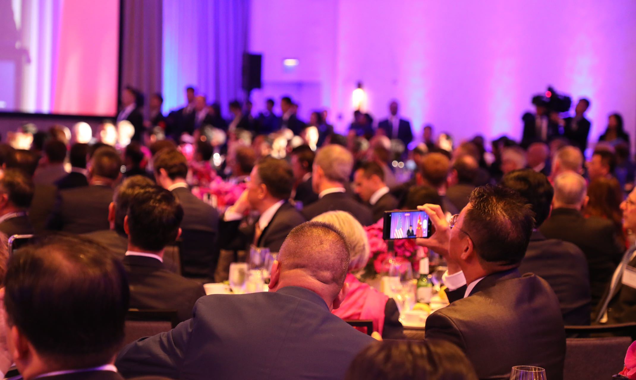 当地时间11月15日晚,国家主席习近平在美国旧金山出席美国友好团体联合举行的欢迎宴会。在热烈的掌声中,习近平发表重要演讲。图为参加晚宴人士认真聆听演讲。人民日报记者 李志伟 摄
