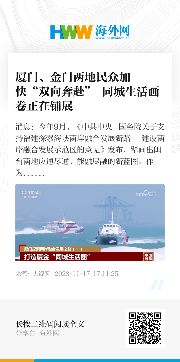 从昔日的烽火最前线到如今的两岸交流最前沿,厦金两地的民众比任何人都更了解和平的可贵。步入新时代,对美好生活的共同追求,让两地民众加快了“双向奔赴”,一幅基建联通、产业共兴、待遇共享的同城生活画卷正在展开。