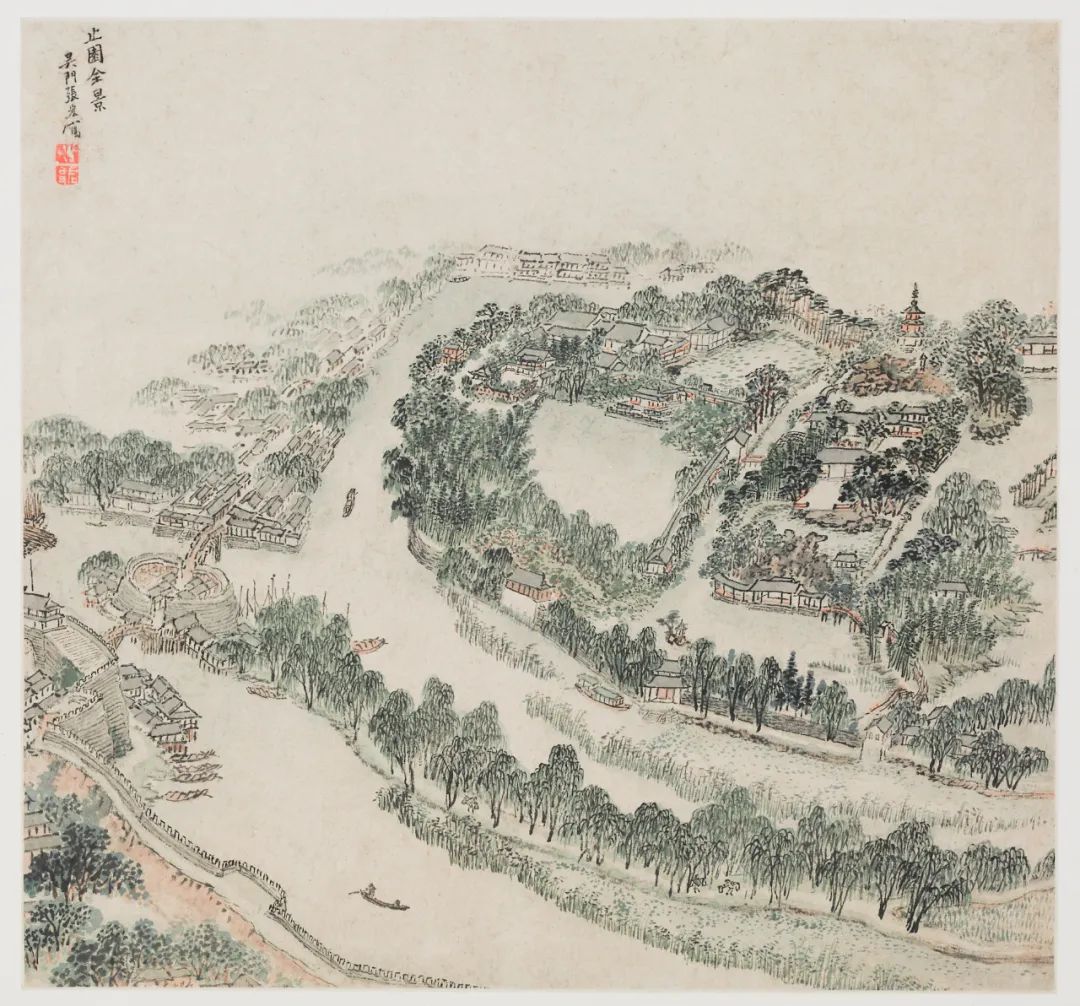 以图像的形式表现一座园林,在中国有着悠久的传统,在明代风气尤盛,而画家张宏绘于1627年的《止园图》堪称此类绘画中的巅峰之作——20幅中国山水画套图以细腻写实的风格,从不同角度描绘了一座华美秀丽的明代园林,画作原件分别收藏于美国洛杉矶郡立美术馆和德国柏林亚洲艺术博物馆。