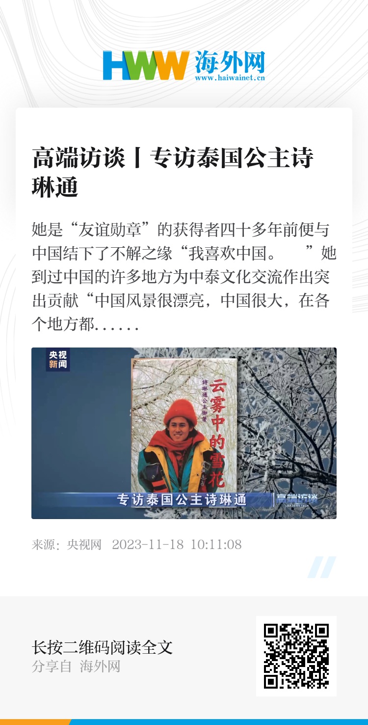 今天我们要对话的嘉宾是一位“中国通”。从中国历史到诗词,再到音乐,她把所感所知写成文字,向本国的民众介绍;从1981年至今,她几乎每年都会来中国,她见证了中国的发展变化,同时也为两国的交往留下了许多佳话。她就是泰国公主诗琳通。这次访华,也是她第五十次来到中国。她为什么会对中国有如此深厚的感情?对于中泰的文明交流互鉴她是如何理解的?关于中泰青年的交流,她又有什么样的期待?一起走进今天的《高端访谈》,对话泰国公主诗琳通。