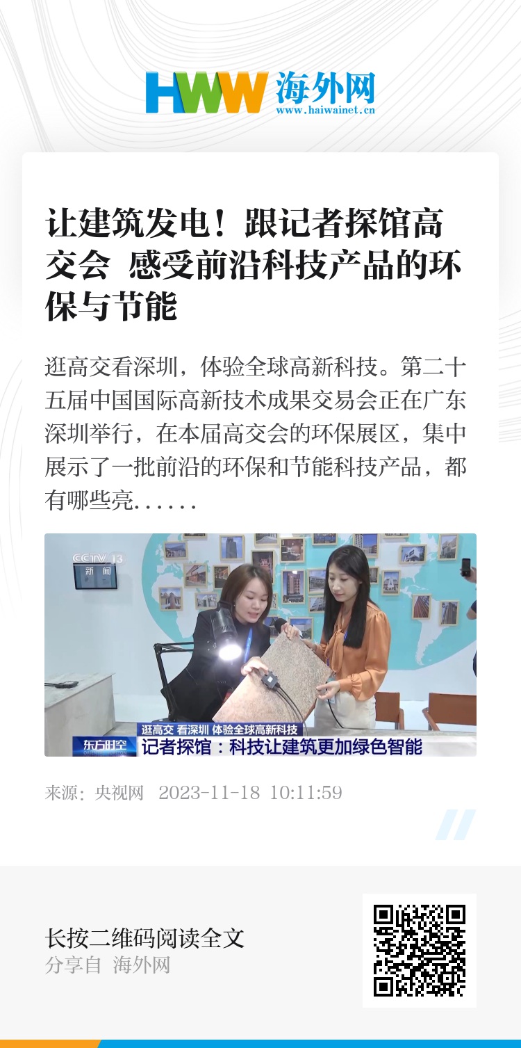 总台央视记者 任梅梅:科技将会给我们未来建筑带来什么样的改变呢?在高交会的现场,我们看到了这样一款看似普通的建筑面材,但其实它是一款经过特殊设计、非常环保的零碳建筑面材,当它融合了光电技术之后,可以发电,还可以变身成为显示屏,这也是这项技术首次走出实验室,在高交会上与大家见面。