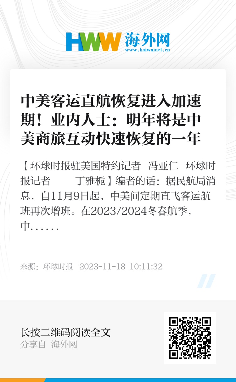【环球时报驻美国特约记者 冯亚仁 环球时报记者 丁雅栀】编者的话:据民航局消息,自11月9日起,中美间定期直飞客运航班再次增班。在2023/2024冬春航季,中美直飞客运航班有望每周从目前48班增至70班,双方航空公司每周各运营35班。中美直航增班,对票价及商旅需求有哪些影响?中美客运航班何时能全面恢复?又带来哪些商旅机会?