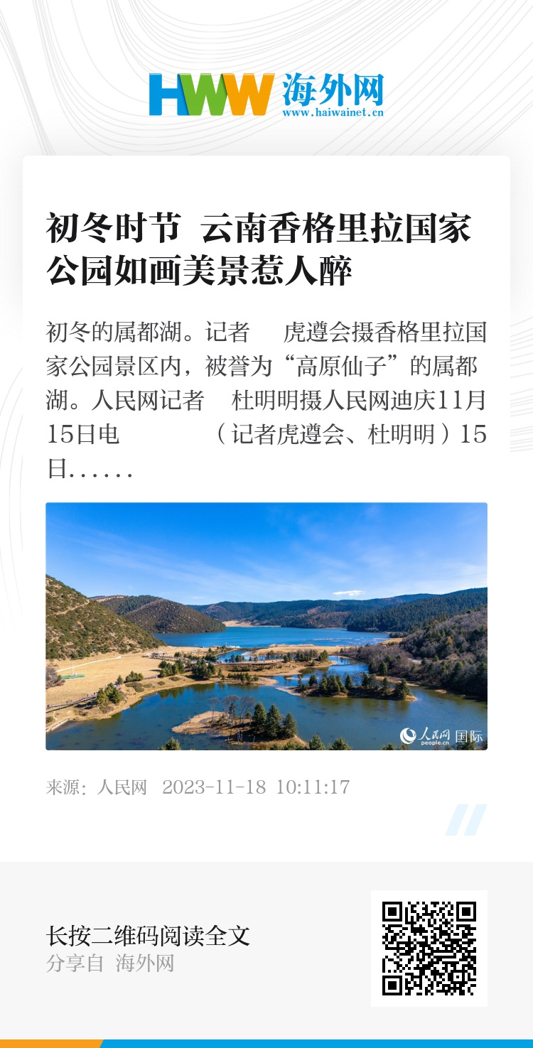人民网迪庆11月15日电 (记者虎遵会、杜明明)15日,记者跟随“世界的香格里拉”主题采访活动,探访位于云南省迪庆藏族自治州的香格里拉国家公园。正值初冬时节,公园内高山森林、湖泊草甸层林尽染、色彩斑斓,红、黄、蓝、绿等各色交织,构成一幅幅醉人的美丽画卷。