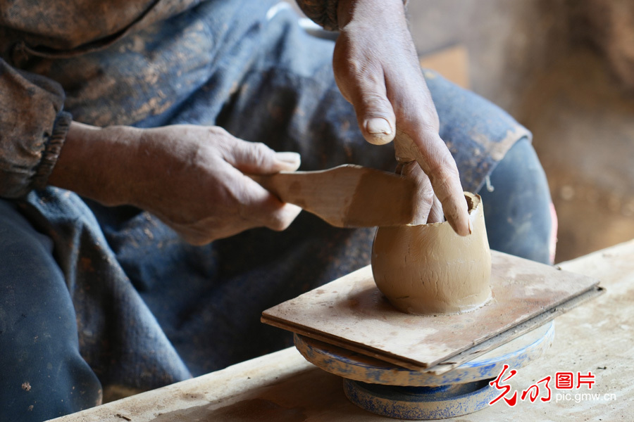 2023年11月16日,云南省香格里拉市尼西乡汤堆村,黑陶手艺人格茸汪堆在制作黑陶。(光明网记者 赵金悦摄/光明图片)