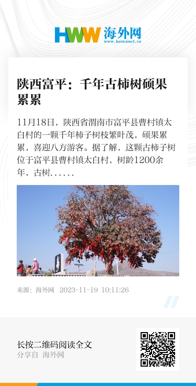 11月18日,陕西省渭南市富平县曹村镇太白村的一颗千年柿子树枝繁叶茂,硕果累累,喜迎八方游客。据了解,这颗古柿子树位于富平县曹村镇太白村,树龄1200余年,古树名木保护等级为特级保护。树南北冠径12米,胸径1.2米,树高10米。图片来源:IC photo