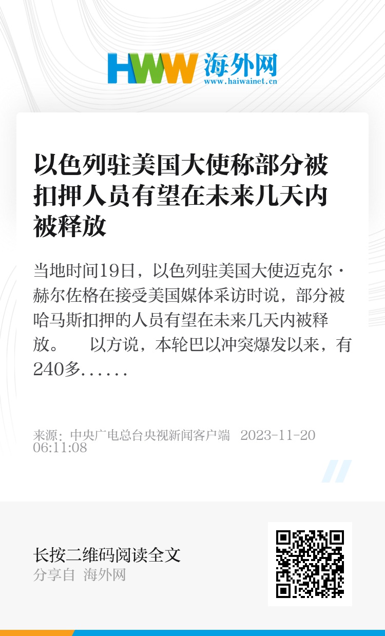 当地时间19日,以色列驻美国大使迈克尔·赫尔佐格在接受美国媒体采访时说,部分被哈马斯扣押的人员有望在未来几天内被释放。