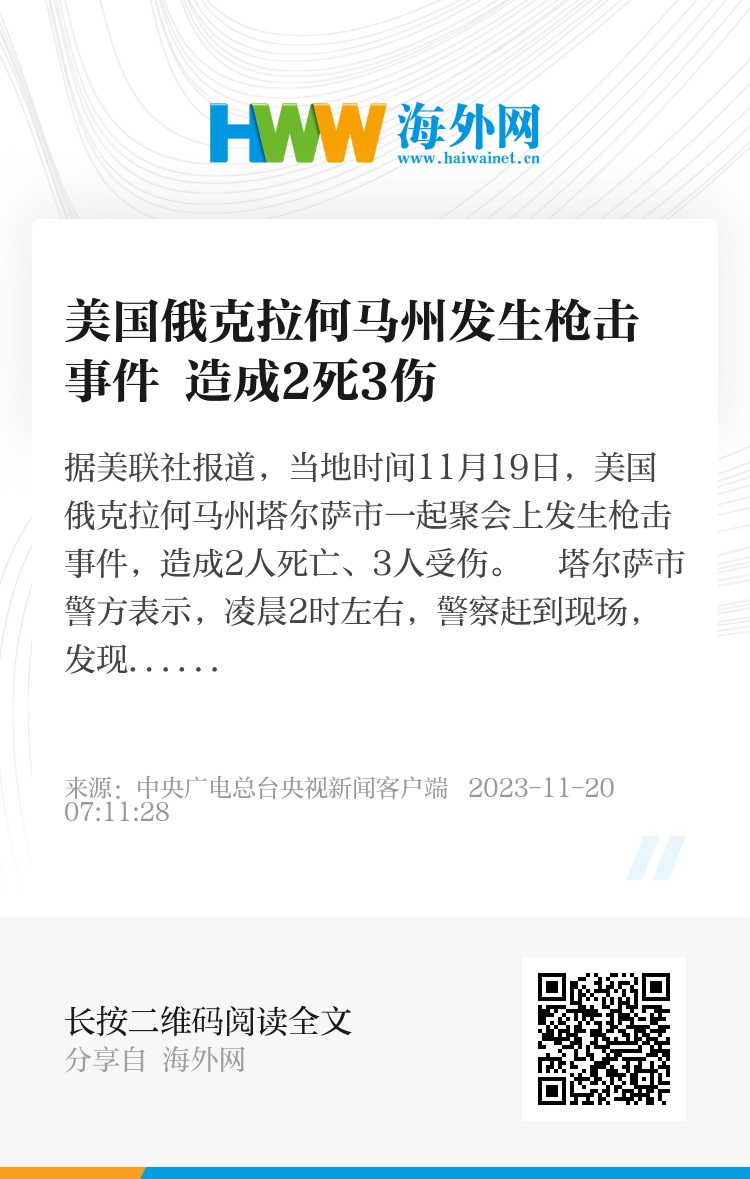 据美联社报道,当地时间11月19日,美国俄克拉何马州塔尔萨市一起聚会上发生枪击事件,造成2人死亡、3人受伤。