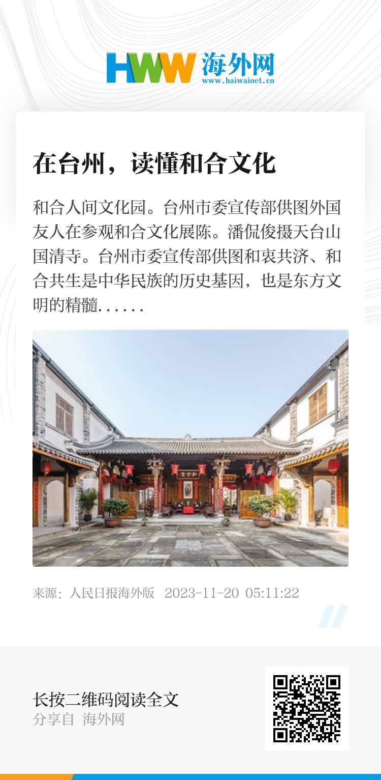 为了更好地挖掘和传播和合文化,台州今年还致力打造和合文化全球传播体系,成立和合文化国际传播中心,通过举办海外青年台州行、和合文化海外行活动等,形成了全媒体、多语种、广覆盖的海内外传播矩阵,让更多人感受到“中国声音”的独特魅力。(窦皓 黄敬惟 泮永翔)
