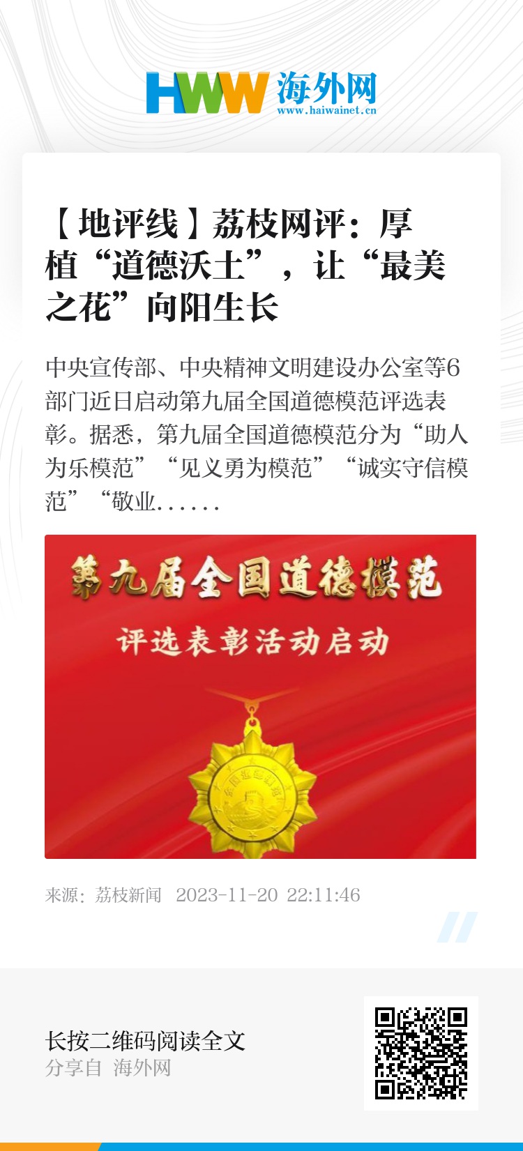 国无德不兴,人无德不立。党的十八大以来,习近平总书记高度重视道德建设,多次会见全国道德模范代表,为他们“点赞”,身体力行、真切号召尊崇道德模范、学习道德模范。发乎于心,践之于行。这些年来,各地方各行业加大对道德模范的培育和关爱,引领带动更多的“好人”“最美”“模范”等不断涌现,处处散发着“博爱”“奉献”之光,展现着“暖色调”的凡人善举。一件件脍炙人口、触达心灵的“利他”故事,体现了中华儿女热爱祖国、奉献人民的家国情怀,展现着自强不息、砥砺前行的奋斗精神。最美之花,灿若星辰。让我们向模范致敬,向榜样学习,让爱的温暖无限传递,不断修身立德,同心共为打牢中华民族的道德根基。
