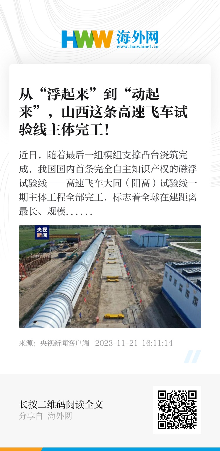 近日,随着最后一组模组支撑凸台浇筑完成,我国国内首条完全自主知识产权的磁浮试验线——高速飞车大同(阳高)试验线一期主体工程全部完工,标志着全球在建距离最长、规模最大的全尺寸超高速低真空管道磁浮交通系统试验线主体工程完成。